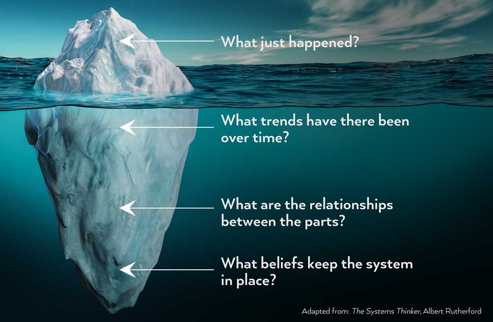 The iceberg model encourages us to look beneath the surface, exploring the root causes, recurring patterns (behaviors), and underlying beliefs and values that drive visible outcomes. Systems thinking invites us to examine the relationships and feedback loops that shape these outcomes, asking questions that build awareness of how structure and behavior are interconnected.